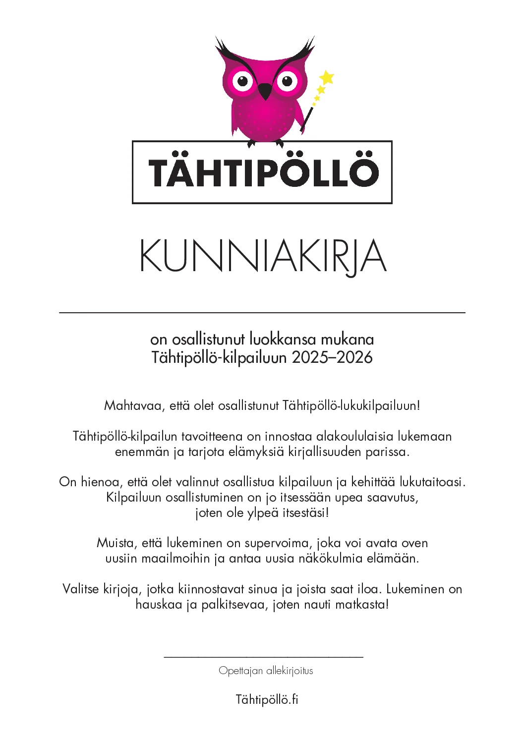 Tulosta Tähtipöllö-kilpailuun osallistuneille oppilaille diplomi.